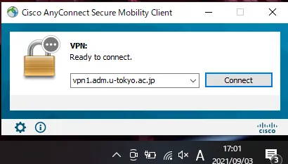 Step E: After launching the “Cisco AnyConnect Secure Mobility Client” installed following the Preparation steps, the window illustrated below will appear. Enter vpn1.adm.u-tokyo.ac.jp as the VPN server. Click the “Connect” button.