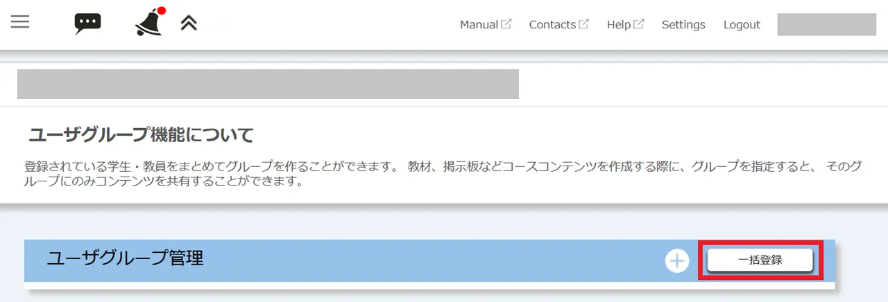 3. 「ユーザグループ管理」の右側にある「一括登録」を押してください.
