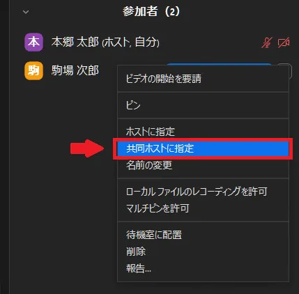 - 表示されたケバブメニュー(「…」のアイコン)をクリックし,「共同ホストに指定」を選択してください.