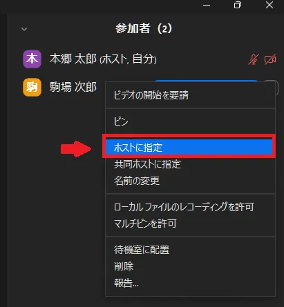 - 表示されたケバブメニュー(「…」のアイコン)をクリックし,「ホストに指定」を選択してください.